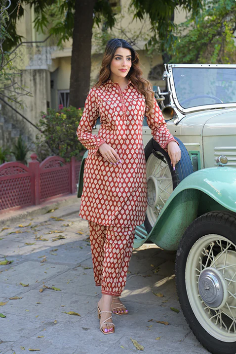 Sunrise Collection Red Ethnic Printed Cotton Fabric Shirt Kurta With Trouser