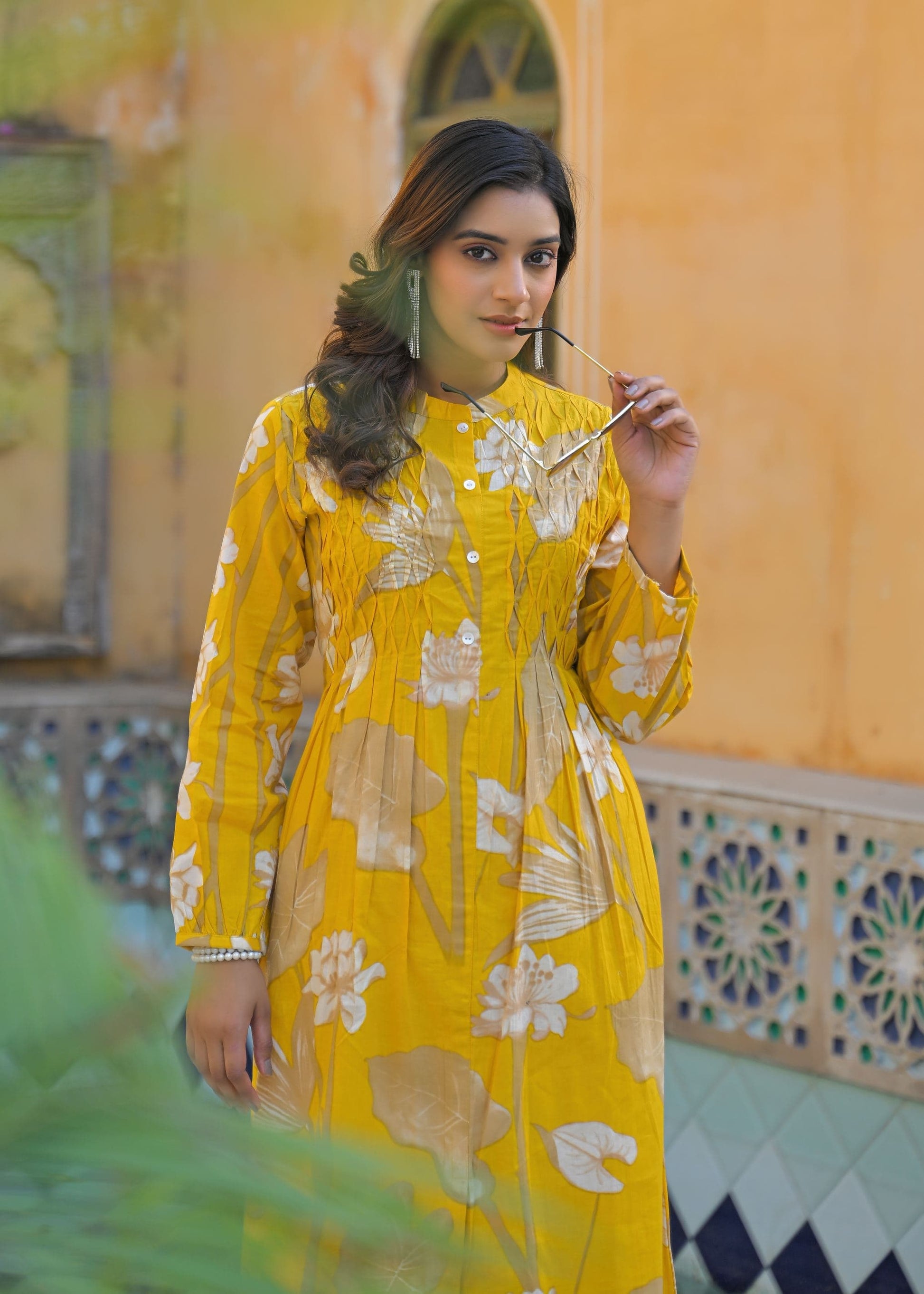 This vibrant yellow kurta set with floral patterns brings a fresh burst of energy and elegance, perfect for casual summer days.